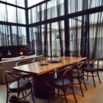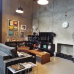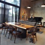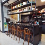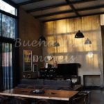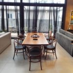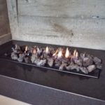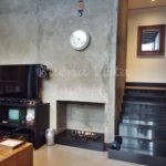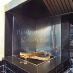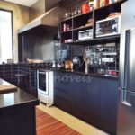 Estar com lareira à gás, jantar e cozinha integrados. Cozinha com móveis planejados, churrasqueira, coifa padrão restaurante.