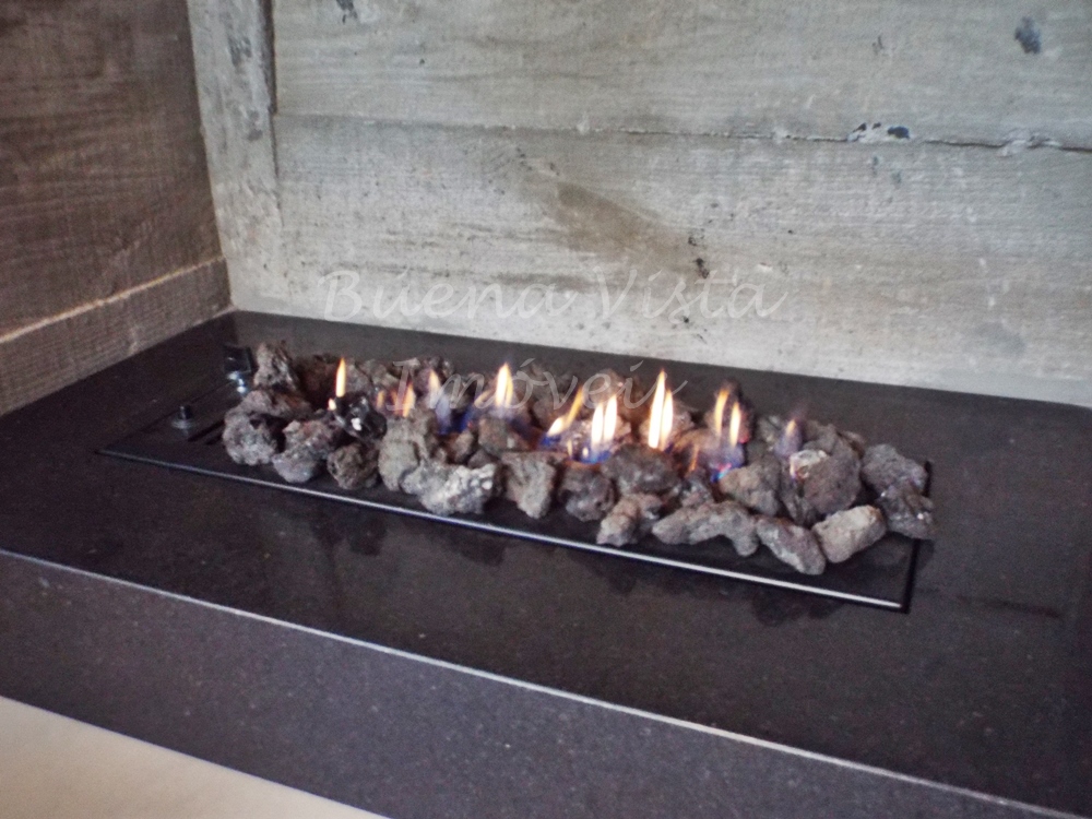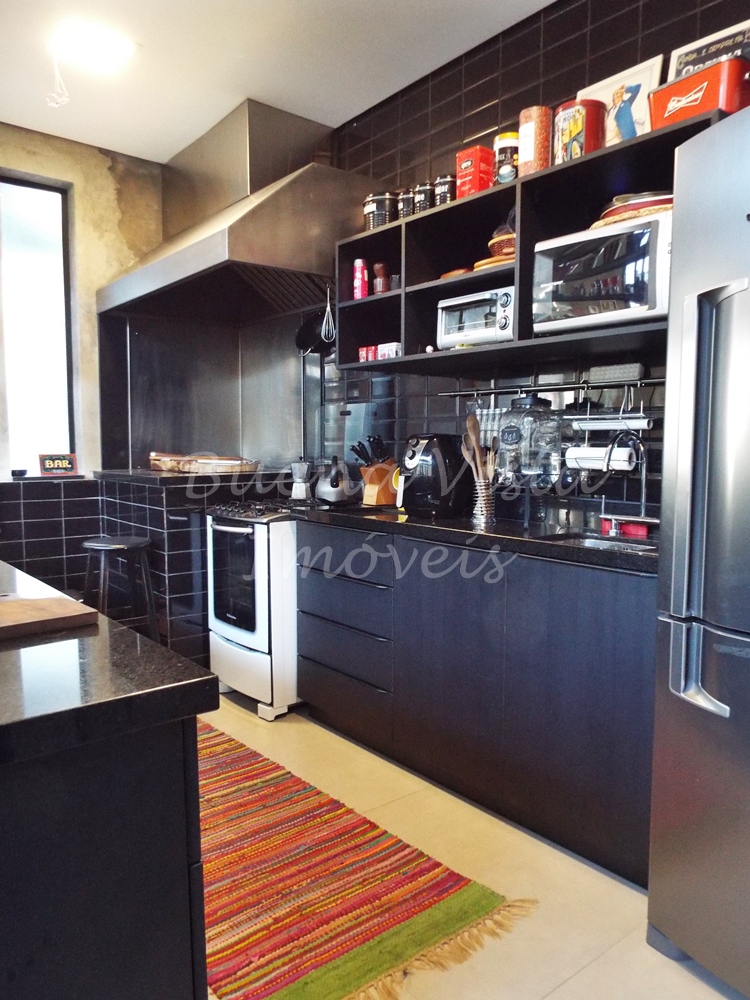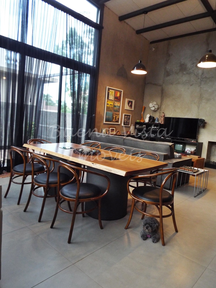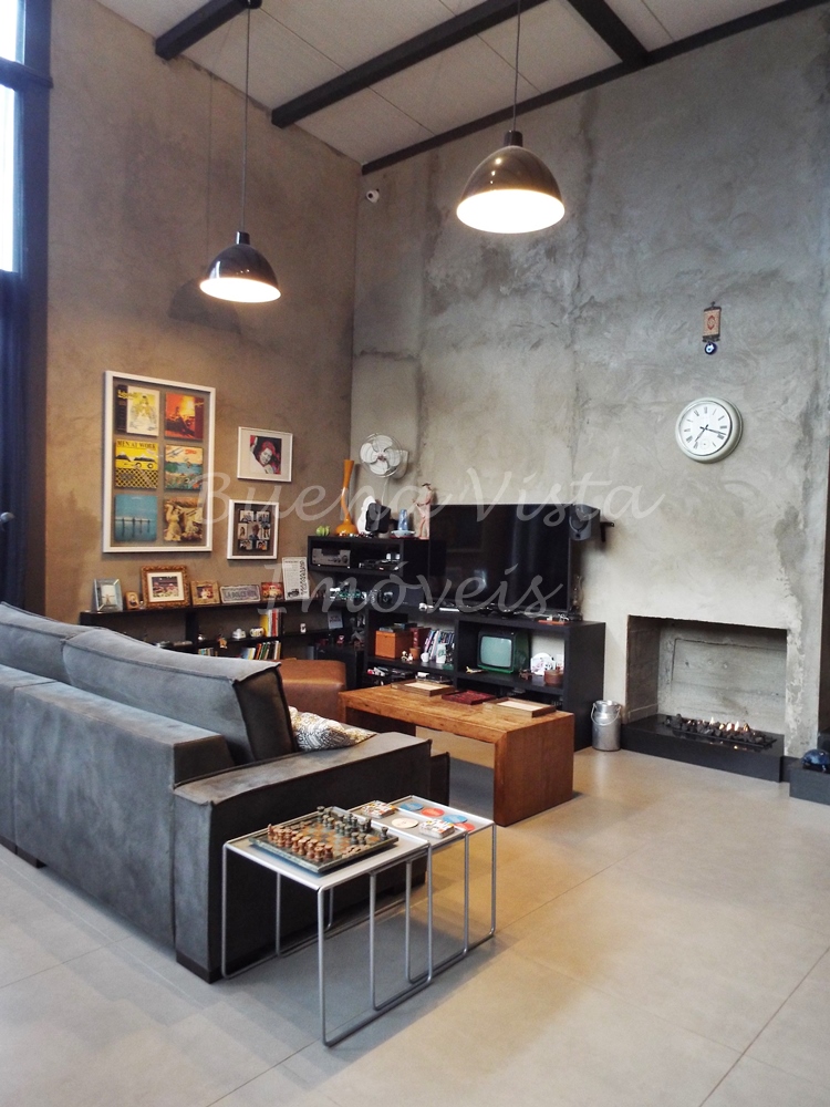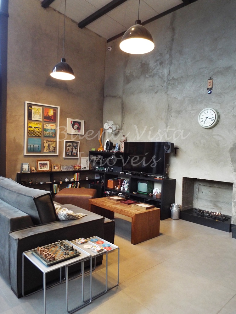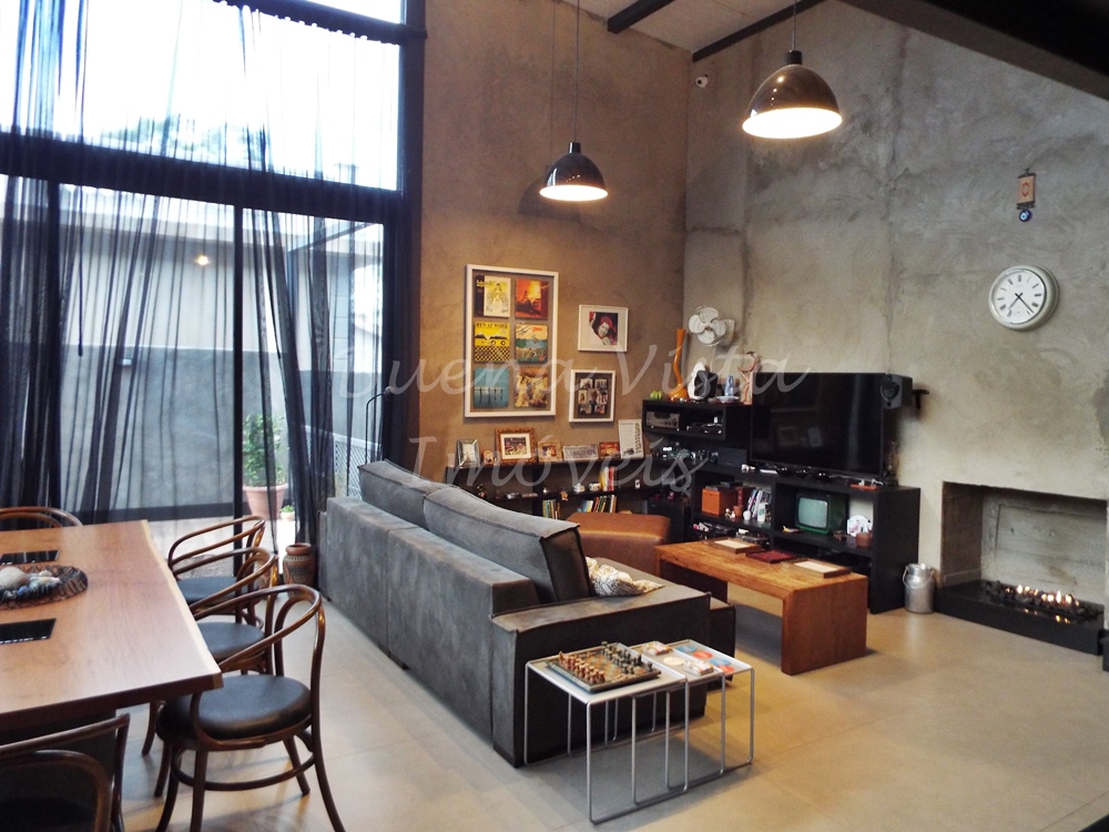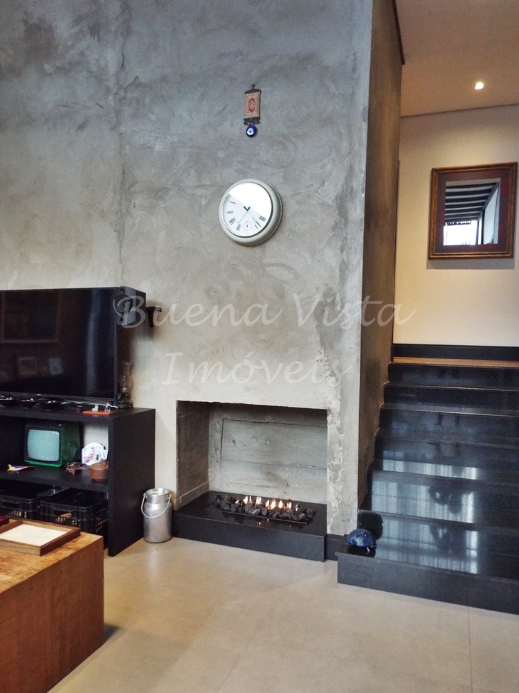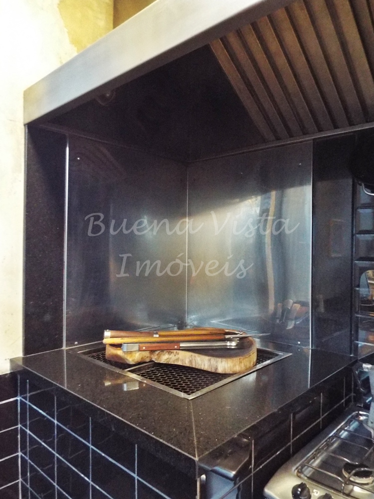 Estar com lareira à gás, jantar e cozinha integrados. Cozinha com móveis planejados, churrasqueira, coifa padrão restaurante.
