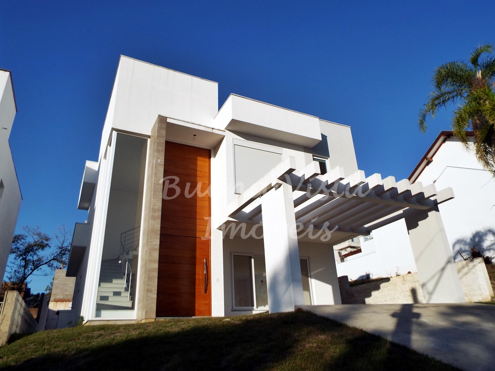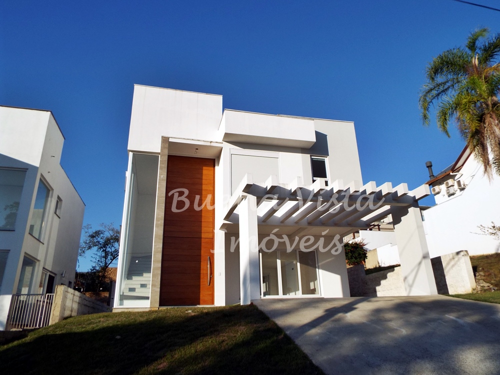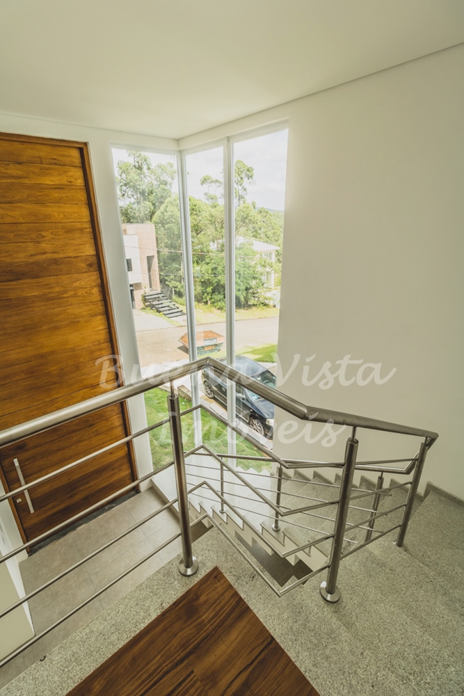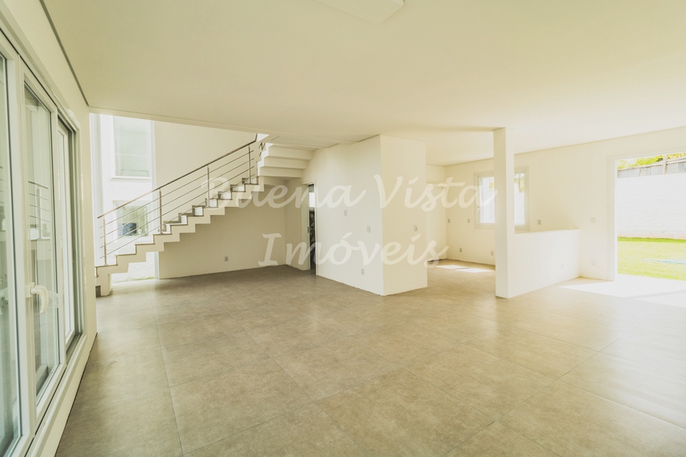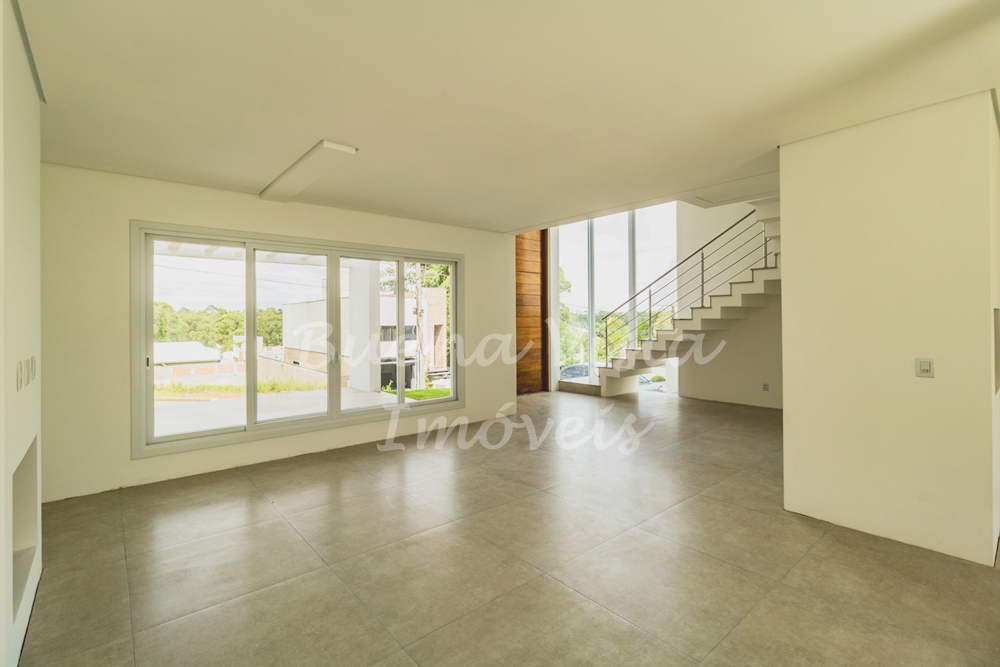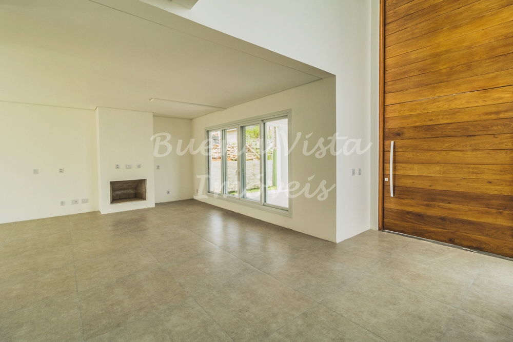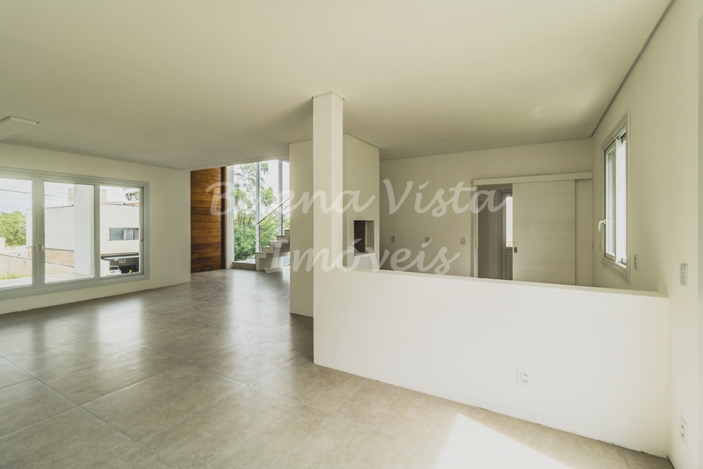 Térreo: Hall de entrada, estar com lareira, jantar e cozinha integrados. Lavabo, área de serviço e depósito. Garagem para dois carros.