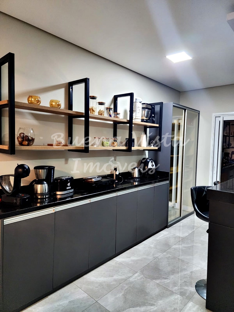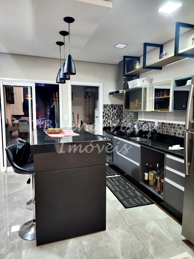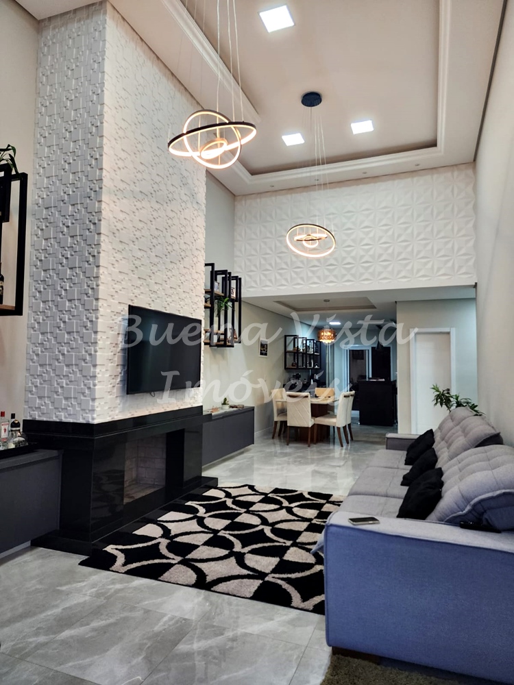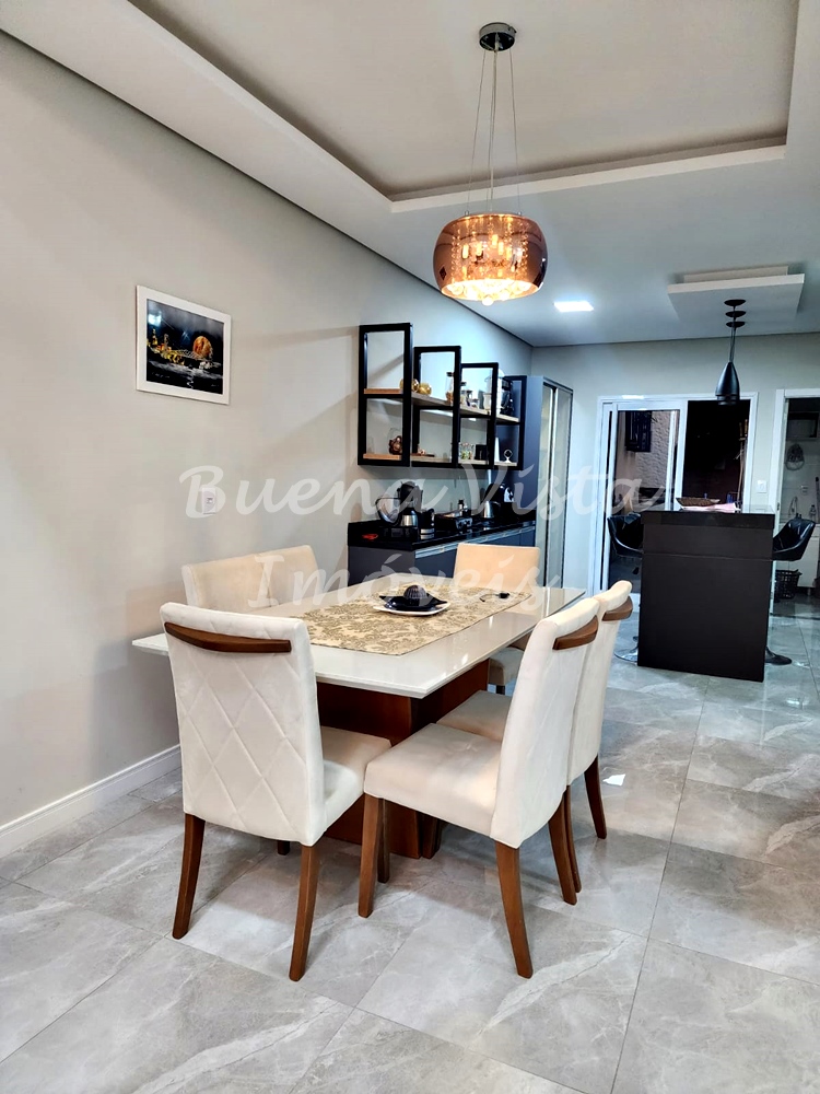Estar com lareira integrado ao jantar, cozinha, lavabo, área de serviço. Área com churrasqueira. Garagem para 2 carros.