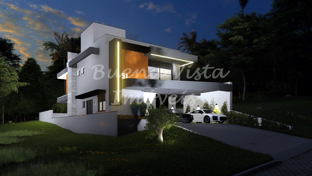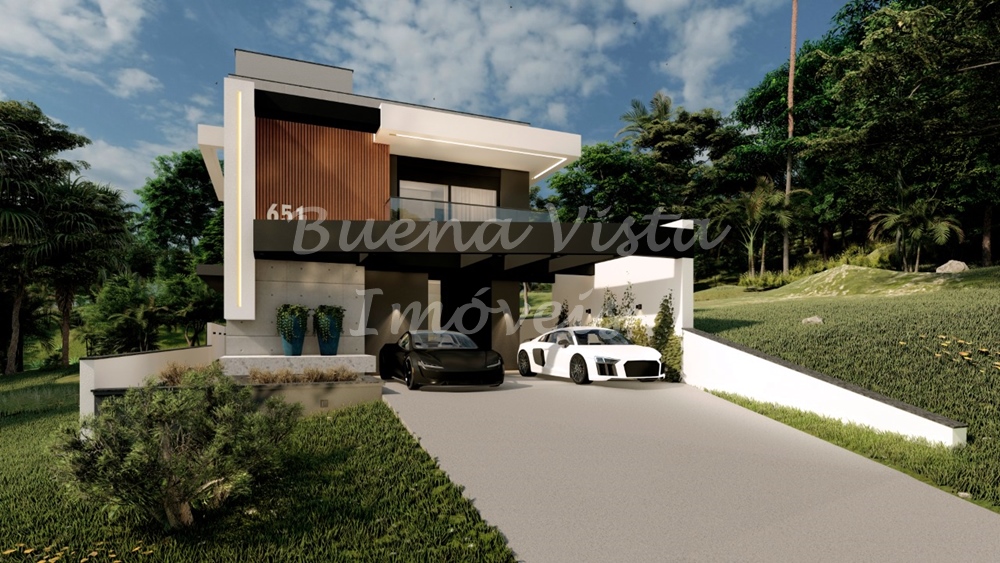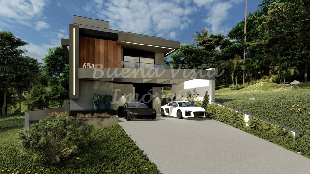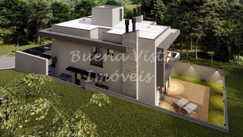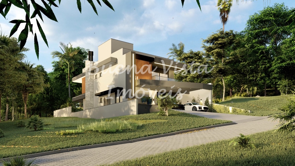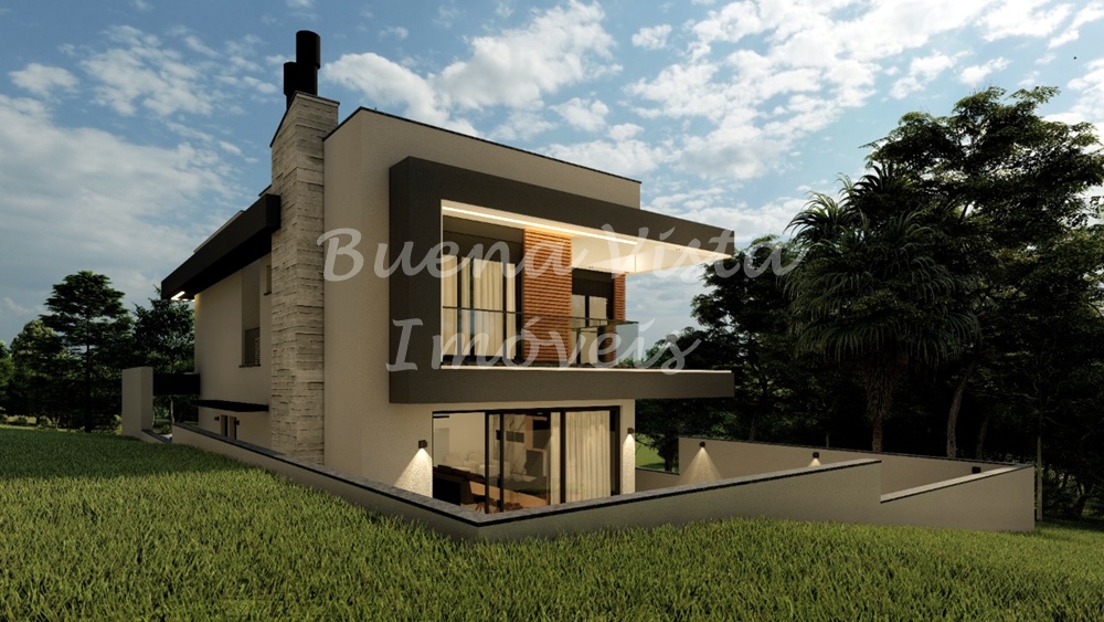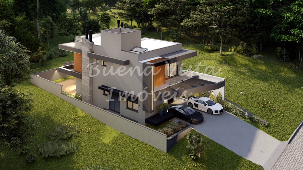 Térreo: Hall de entrada com lavabo, escritório completo ou opção para suíte térrea. Estar com lareira, jantar e cozinha com espaço gourmet integrados. Área de serviço, depósito externo e garagem para dois carros. Amplo deck.