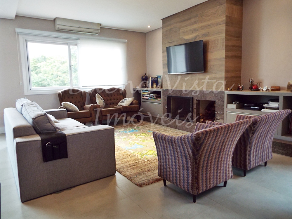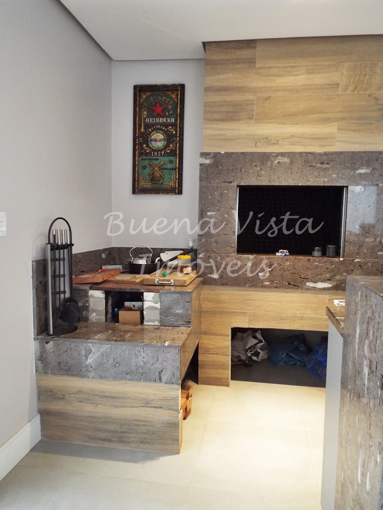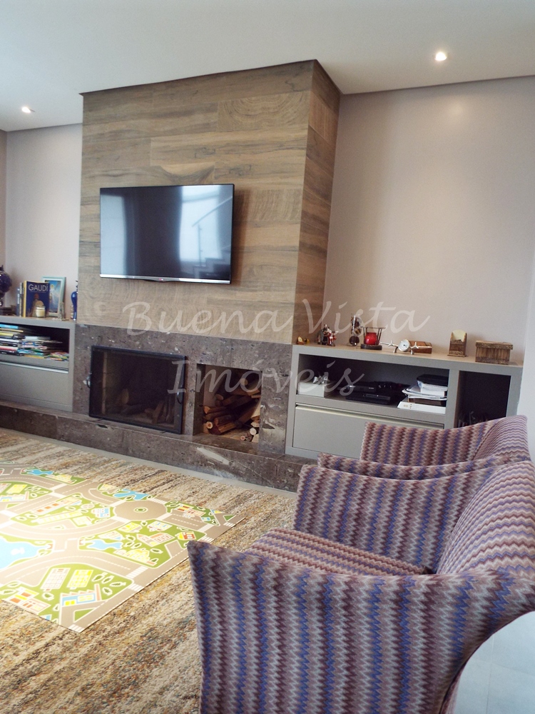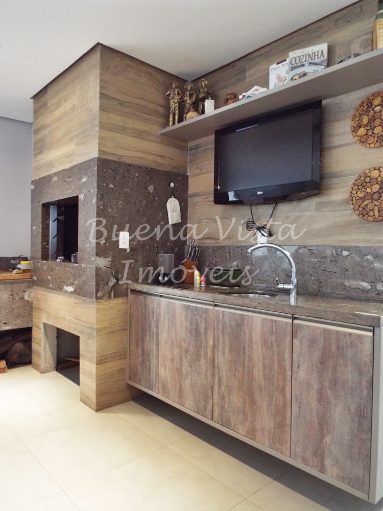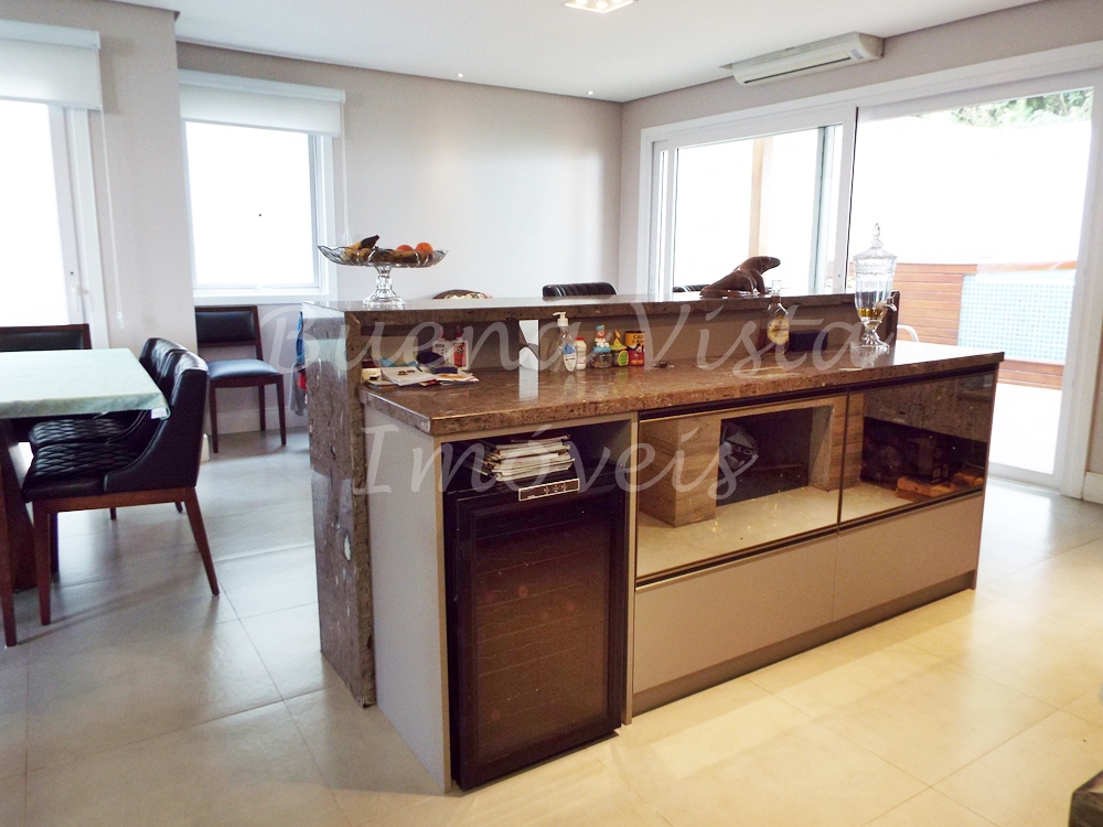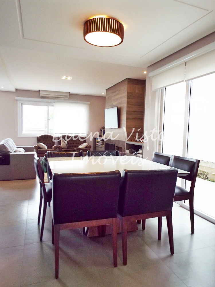 Térreo: Estar com lareira, jantar e cozinha integrados. Lavabo. Espaço gourmet com churrasqueira, fogão campeiro e chopeira. Área de serviço. Depósito. Piscina.