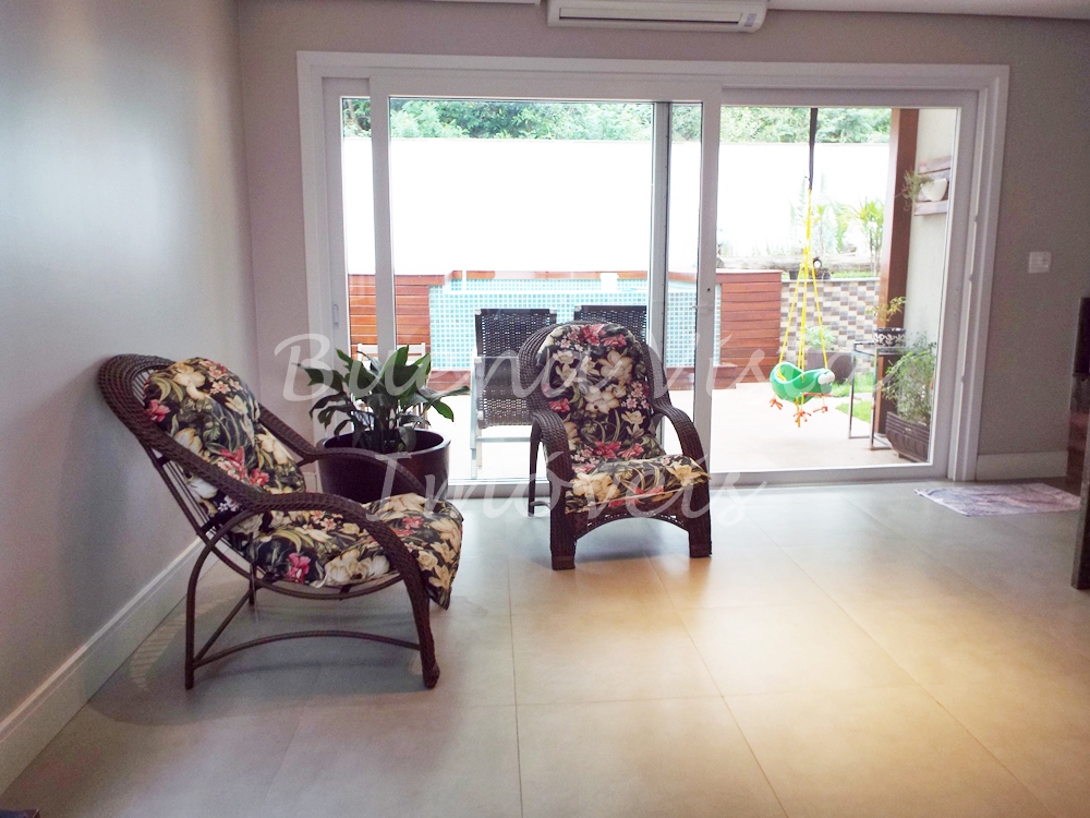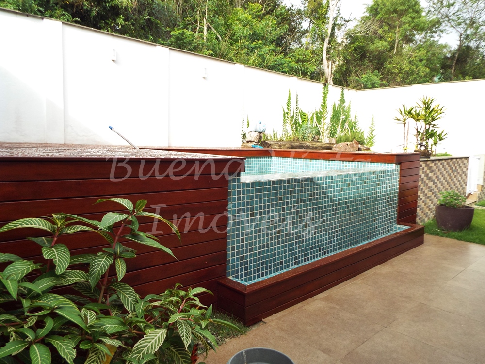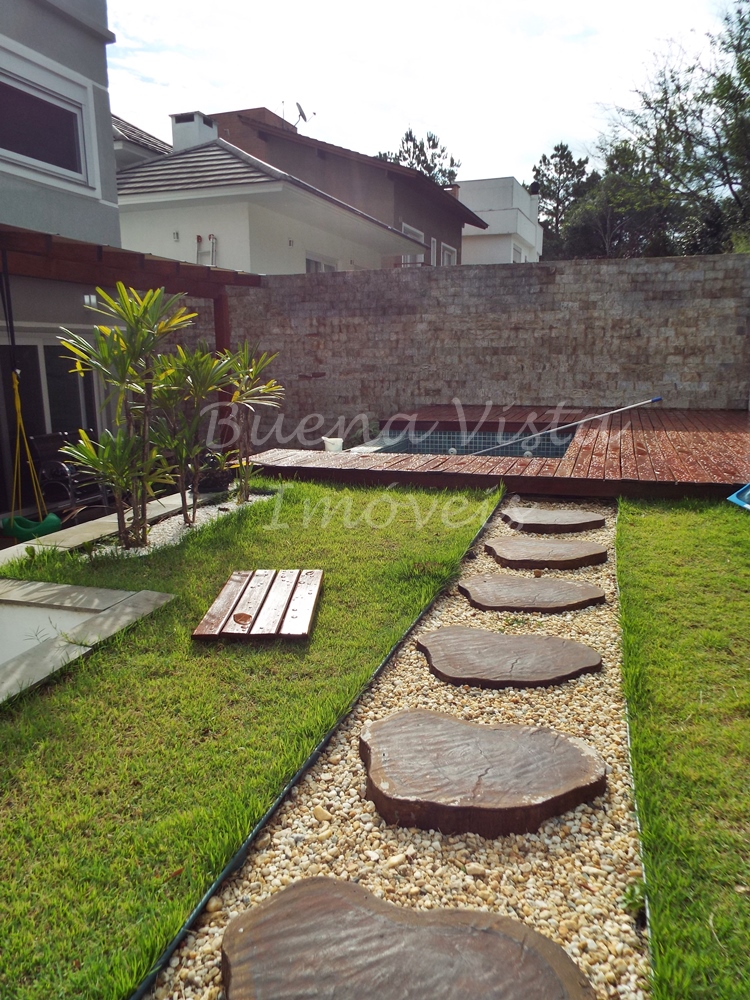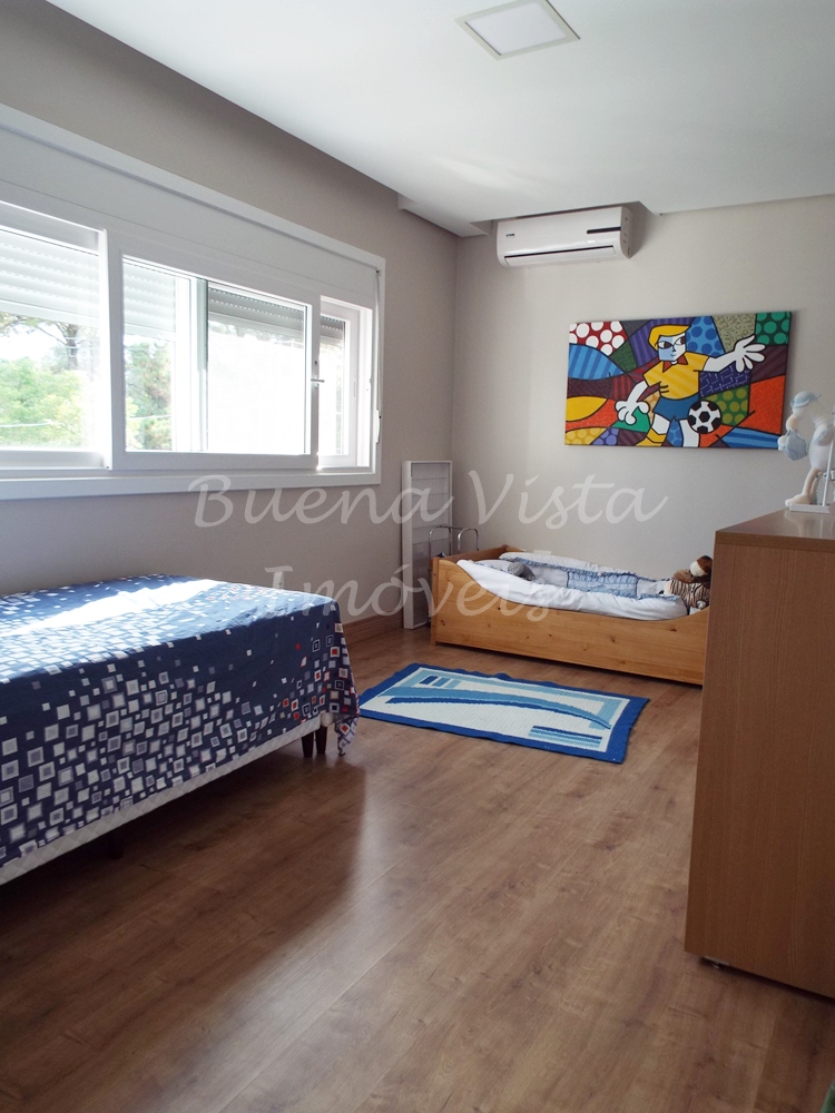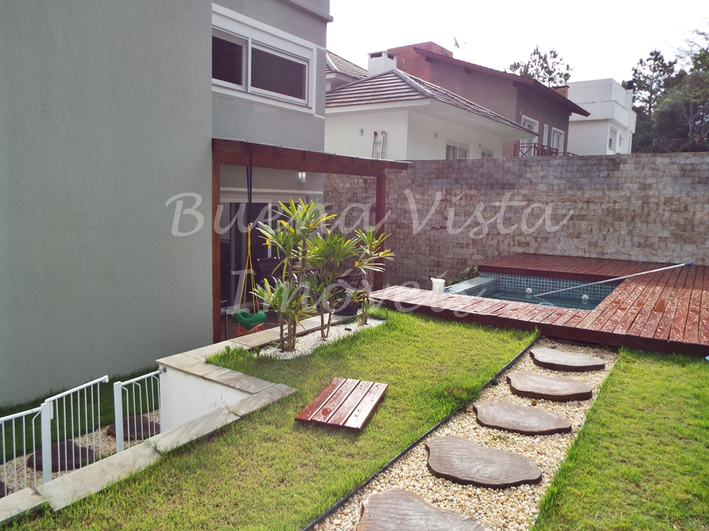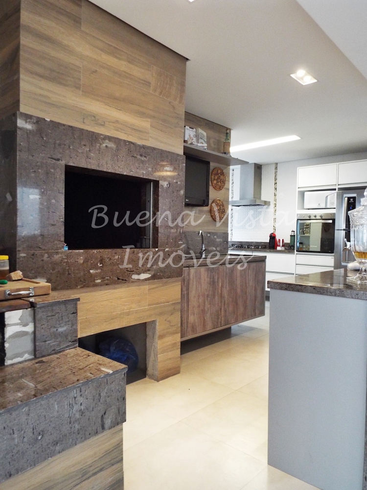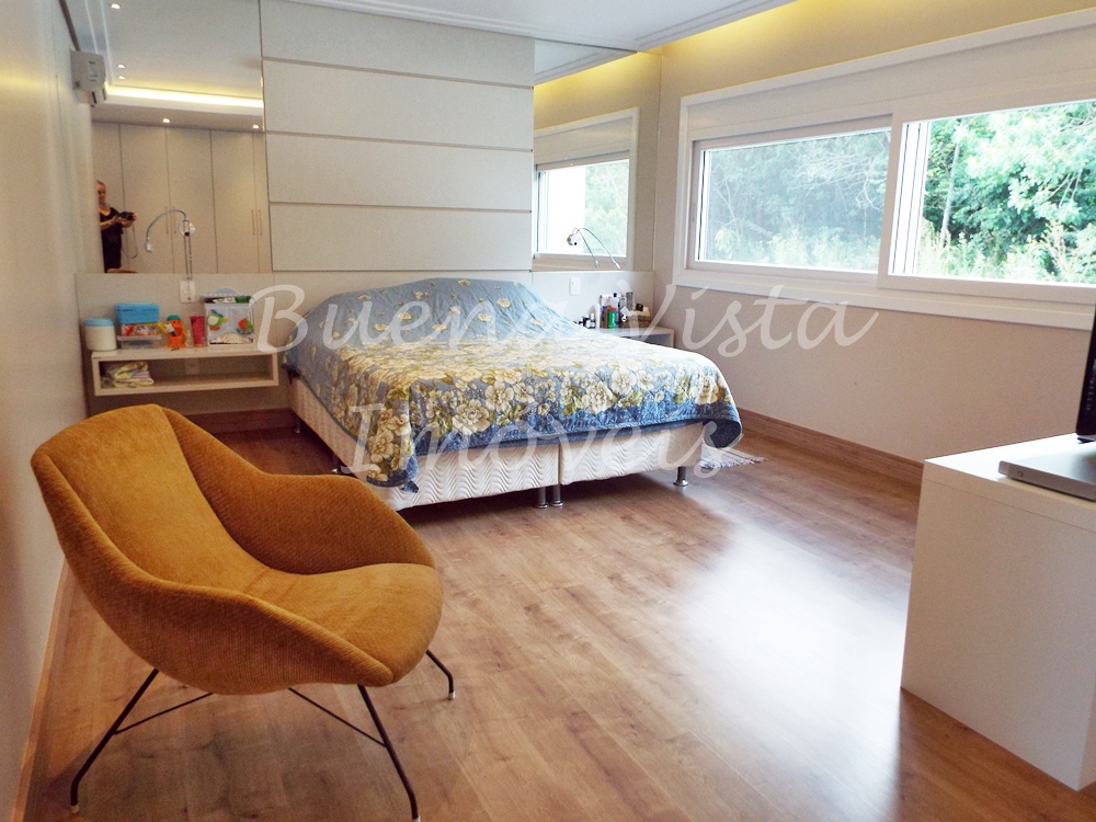 Térreo: Estar com lareira, jantar e cozinha integrados. Lavabo. Espaço gourmet com churrasqueira, fogão campeiro e chopeira. Área de serviço. Depósito. Piscina.