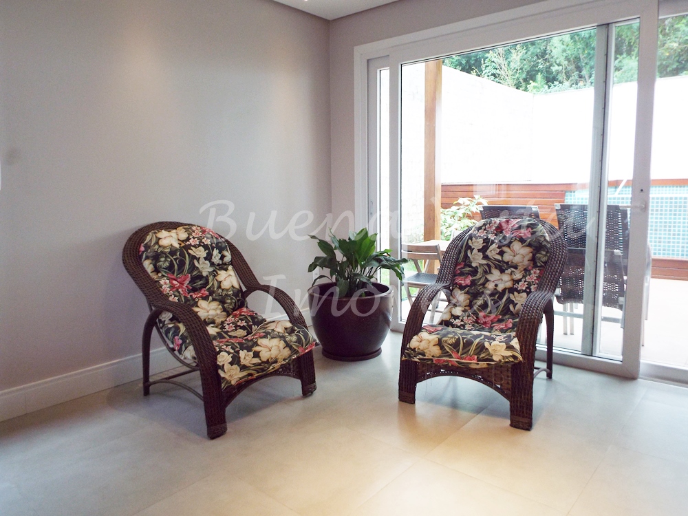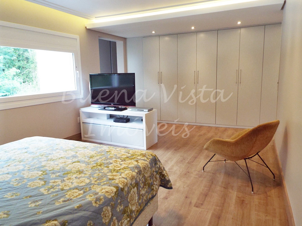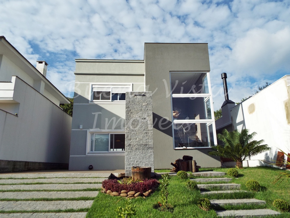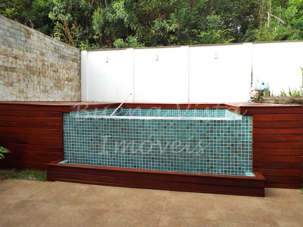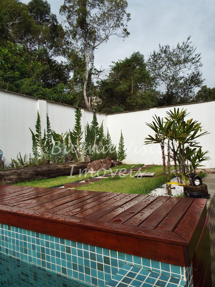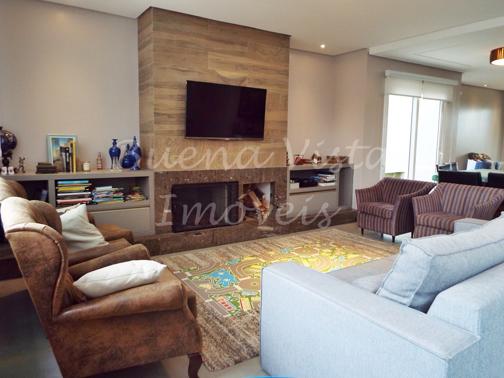 Térreo: Estar com lareira, jantar e cozinha integrados. Lavabo. Espaço gourmet com churrasqueira, fogão campeiro e chopeira. Área de serviço. Depósito. Piscina.