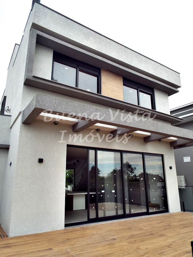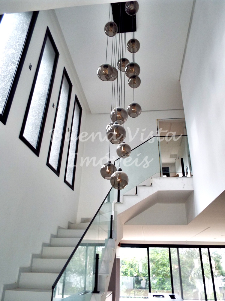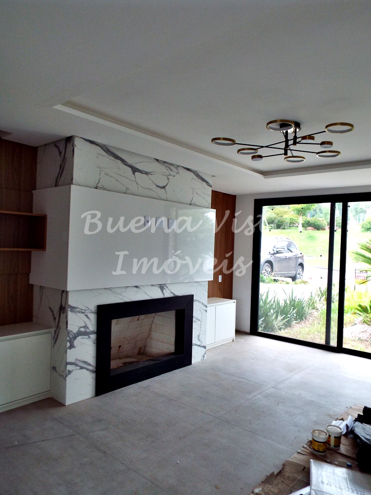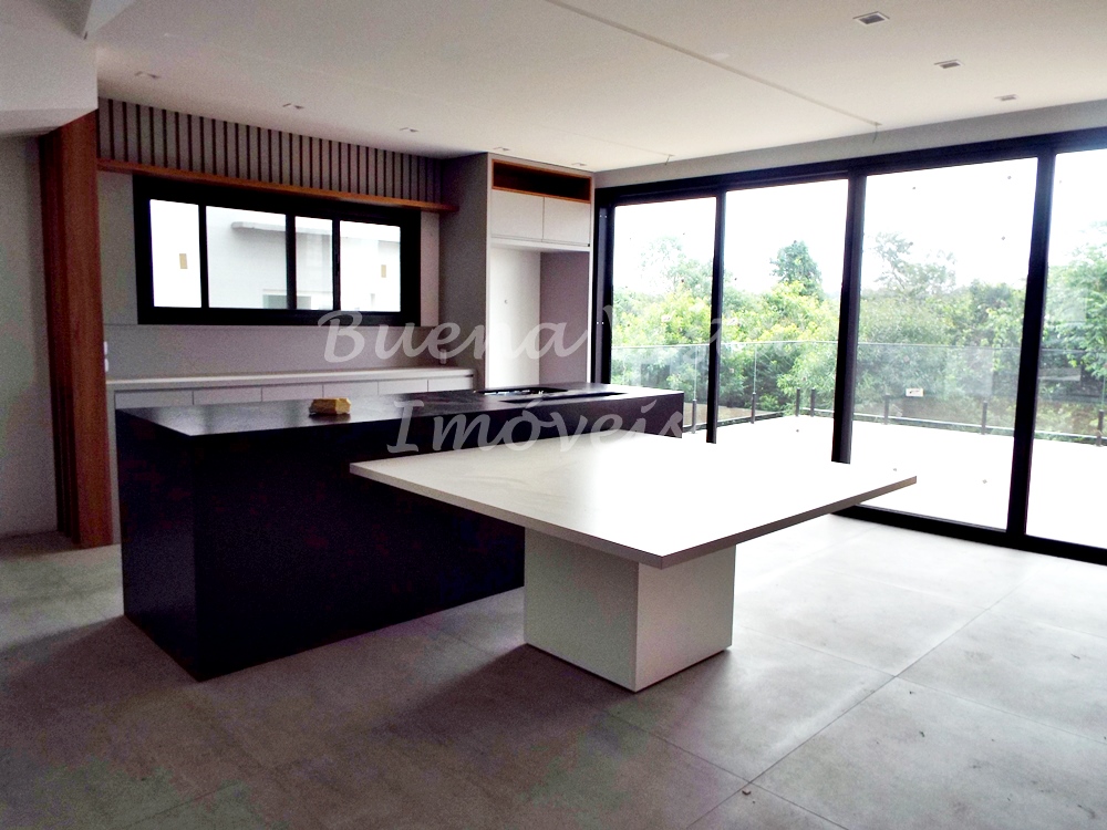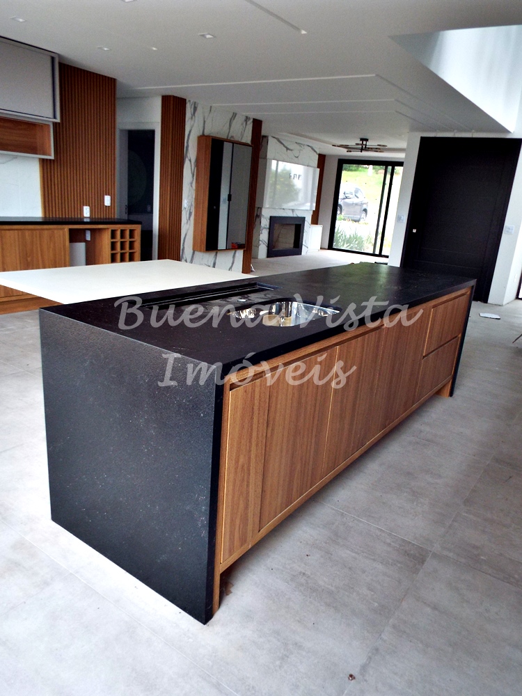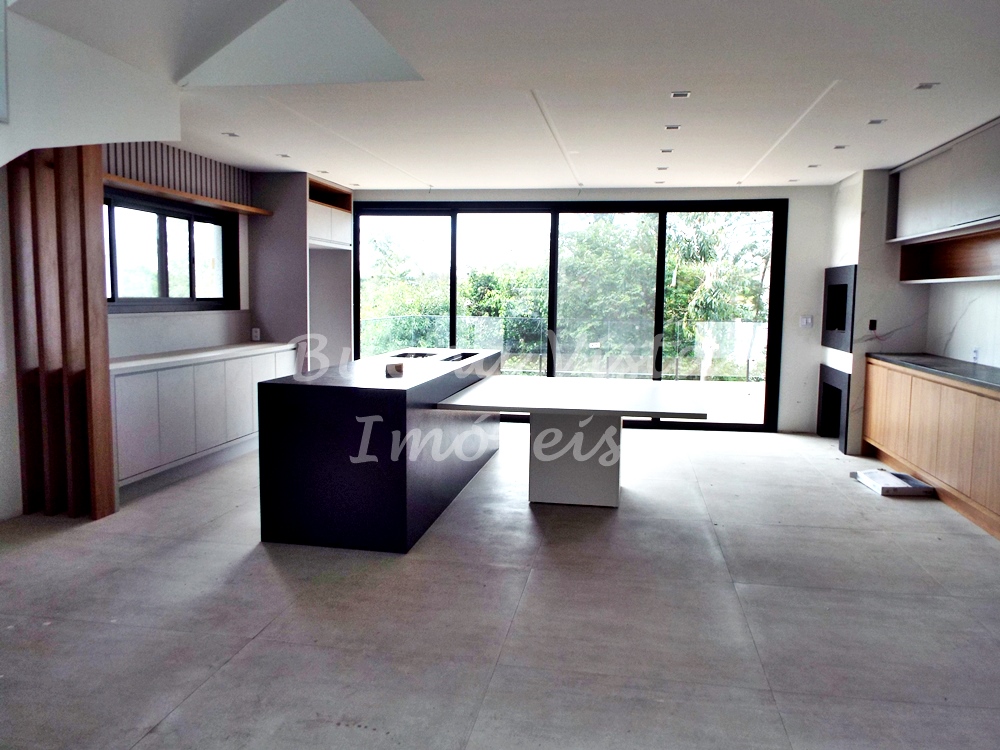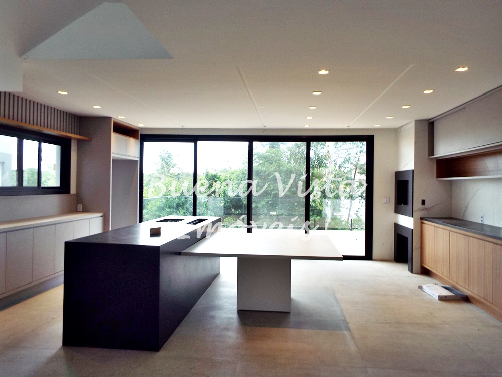 Térreo: Estar com lareira, jantar e cozinha com ilha integrados. Espaço Gourmet com churrasqueira. Área de serviço. Lavabo. Deck externo.