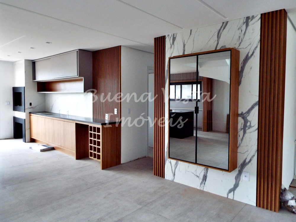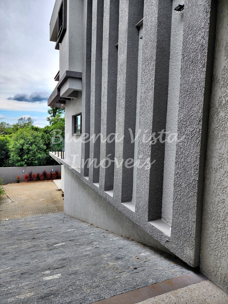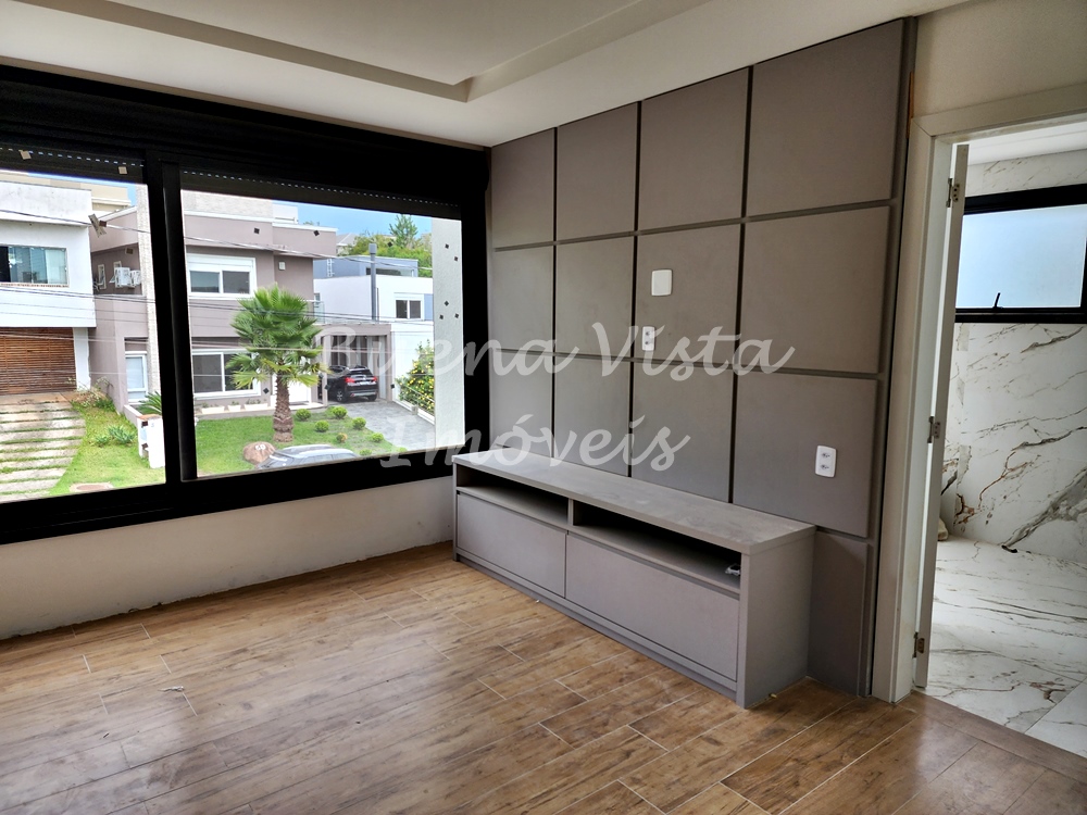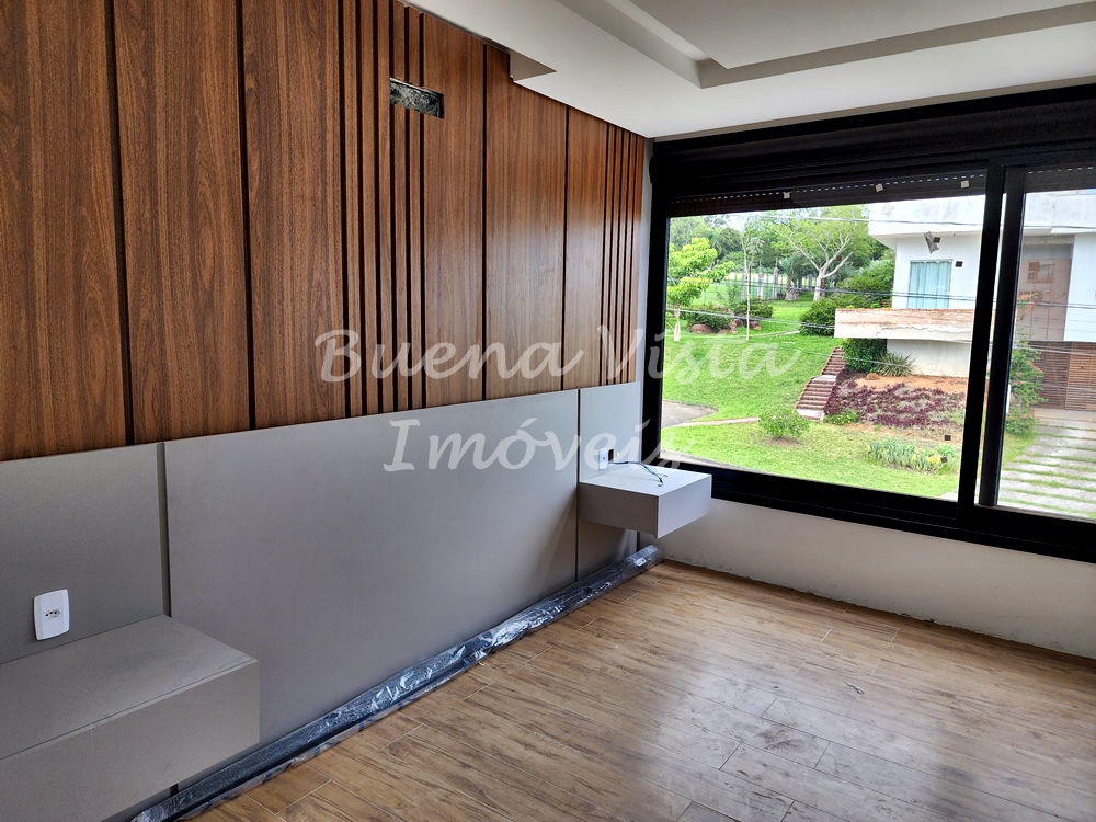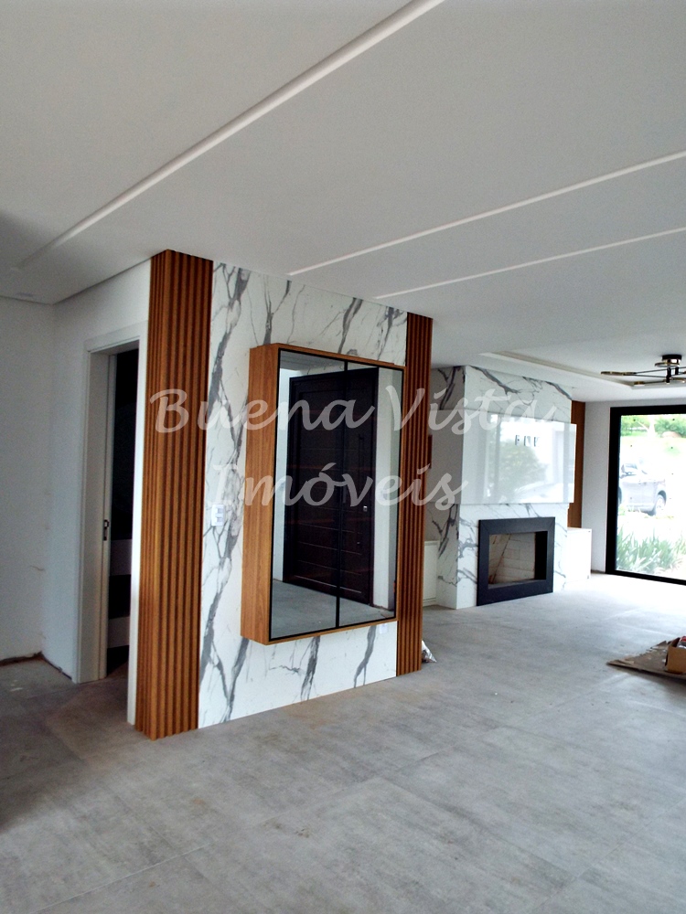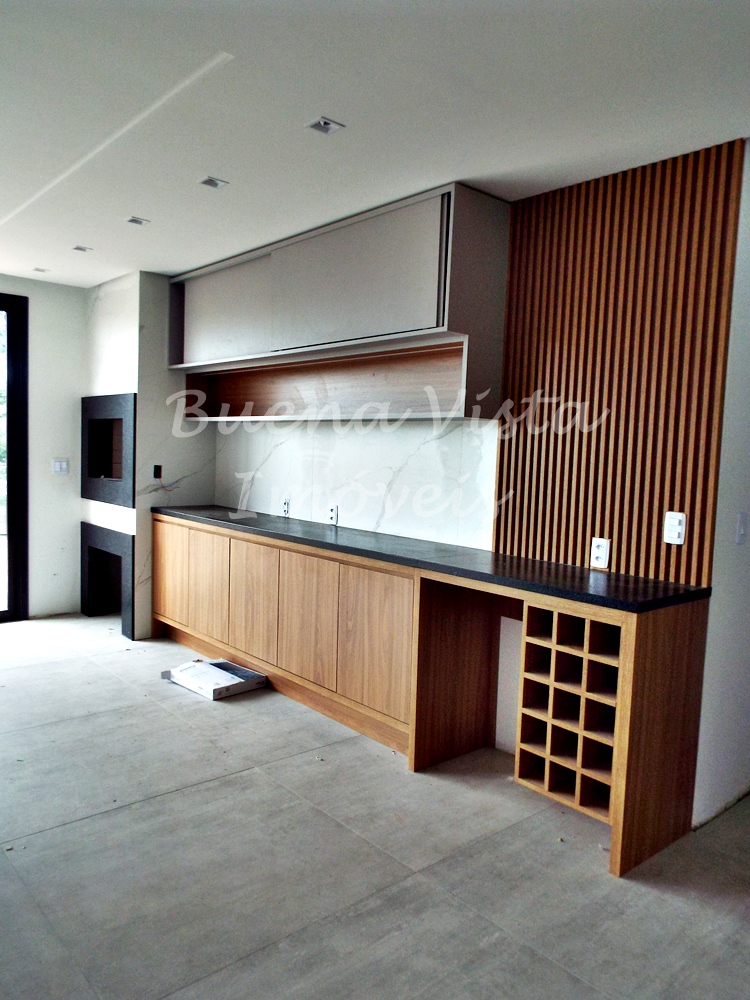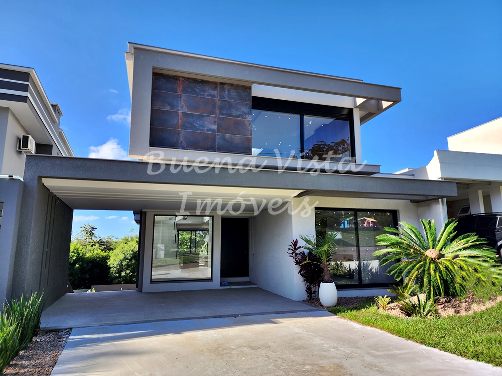 Térreo: Estar com lareira, jantar e cozinha com ilha integrados. Espaço Gourmet com churrasqueira. Área de serviço. Lavabo. Deck externo.