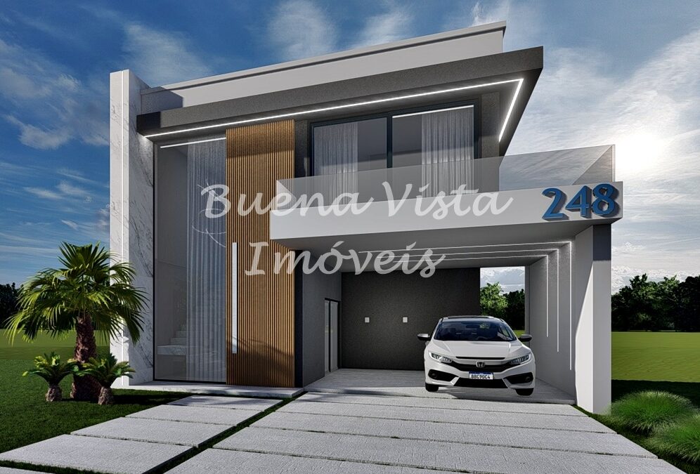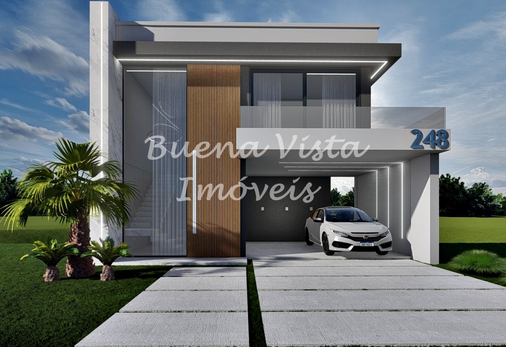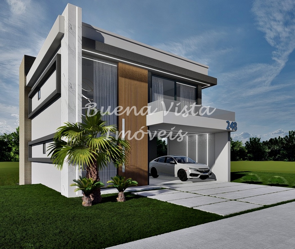 Térreo: Hall de entrada, lavabo, estar com lareira, jantar e cozinha integrados. Garagem coberta para dois carros.